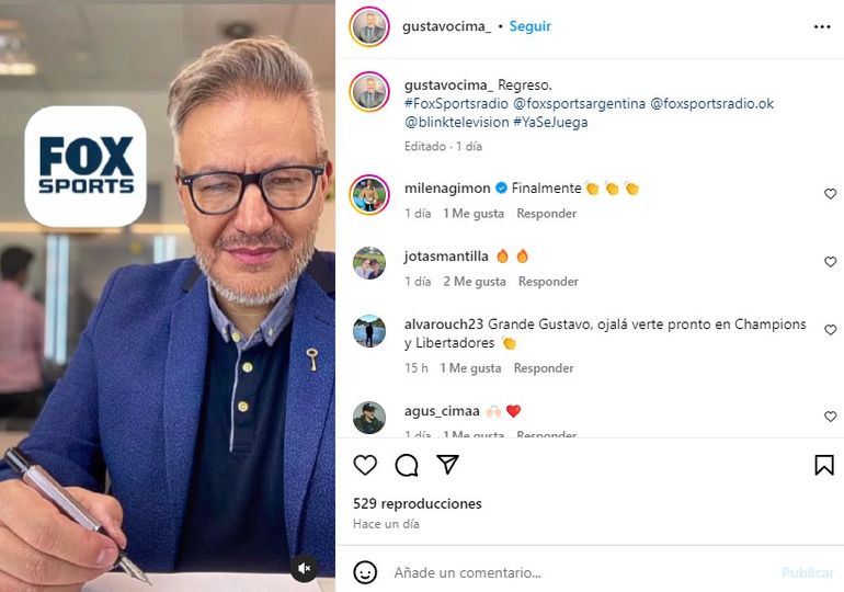 Uno de los medios que fue perjudicado con la decisión que tomó el periodista fue Radio La Red, que perdió a uno de sus relatores estrellas que conforman la grilla. Sin embargo, la cadena televisiva Fox Sports logró contratarlo. Quien decidió afrontar estos cambios en su vida laboral fue el reconocido periodista deportivo Gustavo Cima, quien anunció el arribo a la televisión en un posteo en el que se mostró contento. "Regreso", escribió en la publicación donde se lo puede ver con una lapicera en la mano y el contrato que lo vincula con Fox tendido sobre la mesa.