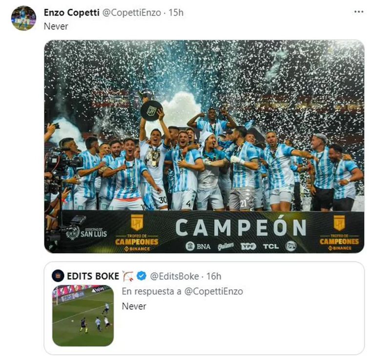 La tensión no quedó en el campo de juego, ya que en las redes sociales continuó la discusión. La cuenta de Twitter "Edits Boke" compartió el video y aprovechó para burlarse de Copetti recordando el penal fallado por Jonathan Galván ante River, y el delantero respondió retuiteando una imagen de la consagración de Racing en el Trofeo de Campeones.