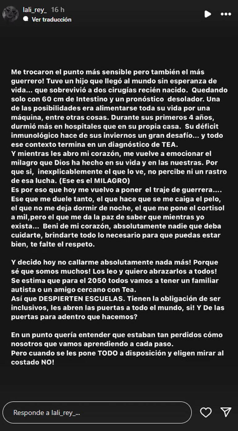 Rey escribió un extenso mensaje en sus historias de Instagram, donde explicó la situación que vive su hijo y el mal trato que recibió en la institución. Benicio, hijo de Rodrigo y Laura, fue diagnosticado con TEA. Durante las últimas dos semanas no pudo asistir al colegio por una enfermedad, pero el regreso no fue como esperaba.