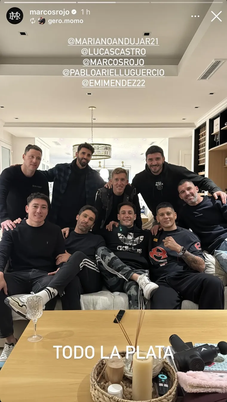 Luego, reposteó una historia del streamer Momo Benavides con la frase “Todo La Plata”, junto a una foto grupal con Damonte, De Blasis, Emi Méndez, Lugüercio, Castro, Andújar y el propio Rojo. La frase, en ese contexto, encendió aún más las especulaciones.