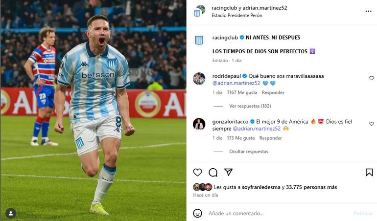 Adrián Martínez es una "Maravilla" en Racing y lo demostró en el último duelo ante Fortaleza de Brasil en el grupo E de la Copa Sudamericano por un golazo de chilena para darle la victoria a Racing en el epílogo del encuentro que se encaminaba para un empate sin tantos. El tanto tomó repercusión y despertó elogios de un campeón del mundo.