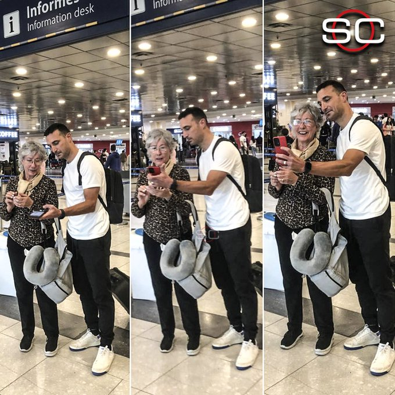 Una prueba más de ello se dio al arribar al aeropuerto de Ezeiza cuando una señora se acercó para pedirle hace una selfie y como a la mujer se le estaba complicando para buscar la cámara e tomar la instantánea, el líder de la Scaloneta le pidió permiso a la mujer para ayudarle y en dos segundos logró inmortalizar el momento.