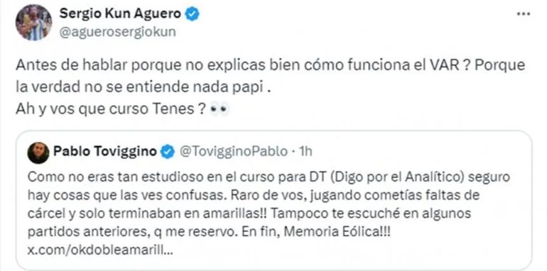 En respuesta a las críticas sobre el VAR, Agüero apuntó: "El VAR está funcionando mal y no hay una explicación de cómo funciona, interviene el VAR cuando quiere y no debería ser así." Además, confrontó a Pablo Toviggino, secretario ejecutivo de la presidencia de AFA, diciendo: "Antes de hablar, ¿por qué no explicas bien cómo funciona el VAR? Porque la verdad no se entiende nada, papi”.