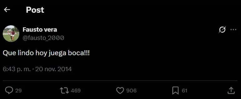 Surgido en las inferiores de Argentinos Juniors y con vasta experiencia en las selecciones nacionales juveniles, habiendo sido capitán de la Sub 23 y siendo parte de los Juegos Olímpicos de Tokio 2020, disputados en 2021, cobró popularidad en las últimas horas una vieja publicación del jugador, que tendría fanatismo por el “Azul y Oro”. “¡Que lindo, hoy juega Boca!” redactó un joven Fausto Vera de tan solo 14 años, que todavía se encontraba jugando en las inferiores del “Bicho”.