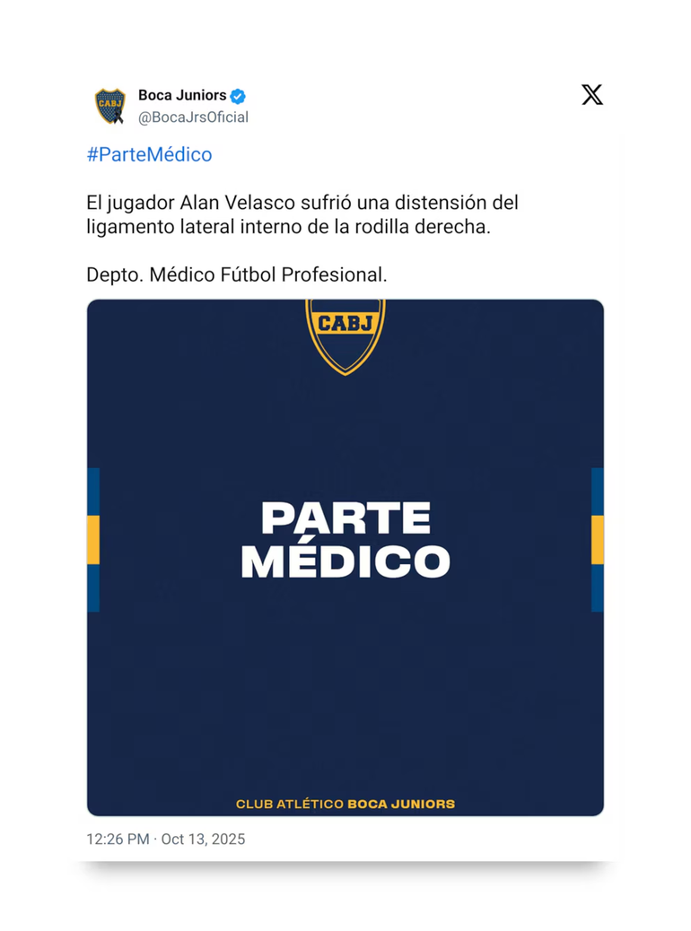 La baja de Velasco representa un contratiempo para el Xeneize en el tramo final del certamen. Con la fase regular programada para concluir a mediados de noviembre y los playoffs en el horizonte, la ausencia del mediocampista obliga al cuerpo técnico a replantear la estrategia para los próximos compromisos.