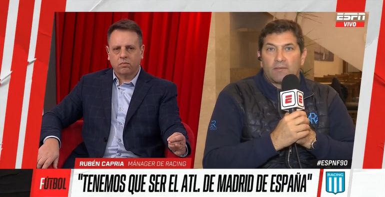 Asimismo, el Mago Capria reveló qué club europeo imaginó que debía imitar Racing antes de iniciar su labor: “Como proyecto deportivo y hoja de ruta siempre pensé que teníamos que transformarnos en lo que es el Atlético Madrid en España, por detrás de Real Madrid y Barcelona (asemejados en Boca y River). Ir en busca de esa posición. Después, ojalá podamos pasarlos, pero de alguna manera esto se ha ido logrando. Hay que ser ambiciosos en el buen sentido de la palabra”.