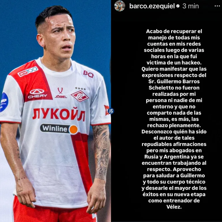 El ex jugador de River, Esequiel Barco, salió a aclarar que los comentarios ofensivos que se realizaron con su cuenta de Instagram en la presentación del entrenador Guillermo Barros Schelotto en Vélez no los realizó él, sino que le hackearon su cuenta.
