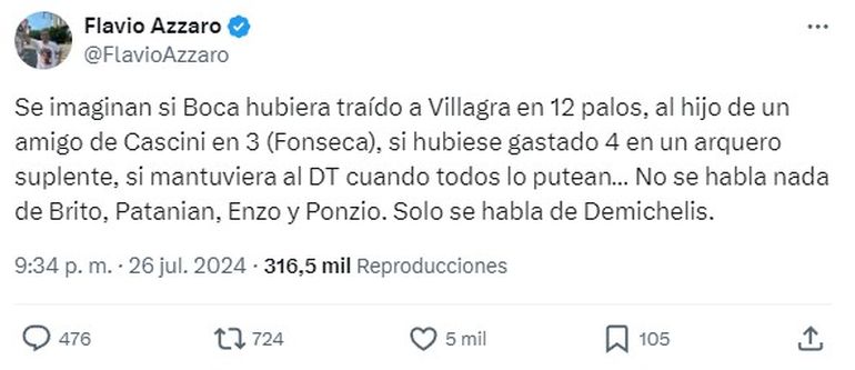 El entrenador del equipo está en la cuerda floja esperando por la decisión de la comisión directiva que será la encargada de definir si el entrenador continúa o no al mando del equipo en las próximas horas previo al encuentro que tendrá el equipo ante Sarmiento de Junín este domingo. En ese marco, el periodista deportivo apuntó directamente contra la comisión directiva del club que encabeza el presidente Jorge Brito. "Se imaginan si Boca hubiera traído a Villagra en 12 palos, al hijo de un amigo de Cascini en 3 (Fonseca), si hubiese gastado 4 en un arquero suplente, si mantuviera al DT cuando todos lo putean…", escribió con un dardo entre líneas en la red social X (ex Twitter).