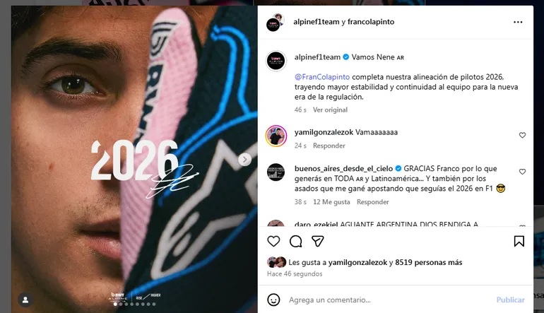 "Franco Colapinto completa nuestra alineación de pilotos 2026, trayendo mayor estabilidad y continuidad al equipo para la nueva era de la regulación", comentaron en un posteo desde la escudería. Colapinto se encuentra en la ciudad brasileña de San Pablo para la disputa del Gran Premio de Brasil, al que catalogó como su carrera “de casa”, por ser la más cercana a la Argentina y llenarse de simpatizantes albicelestes en las tribunas.