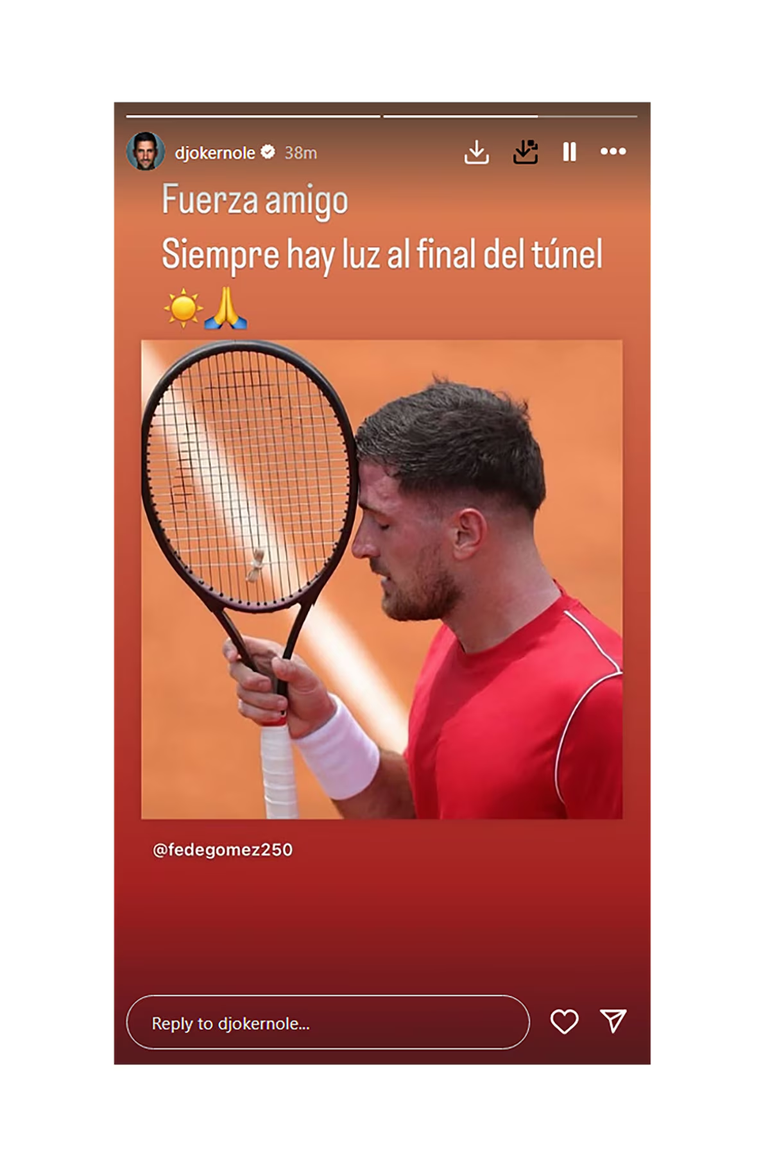 Esto generó alta repercusión en el circuito y Novak Djokovic le dedicó un sentido posteo: “Fuerza amigo. Siempre hay luz al final del túnel”, fue el texto, en idioma castellano, que el serbio incluyó citando el posteo de Gómez, quien había graficado su notificación con una foto propia en la que está con los ojos cerrados.