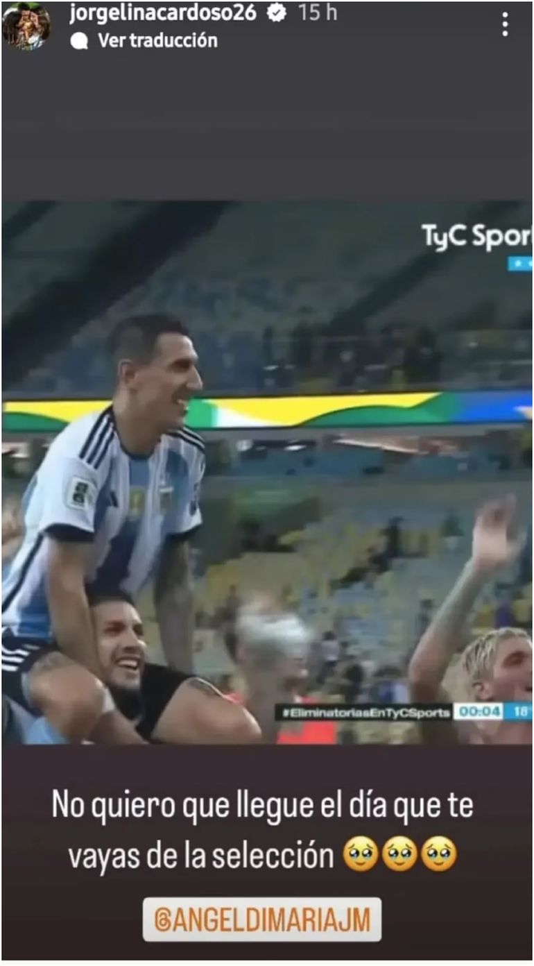 En medio de la conmoción por la posible renuncia de Lionel Scaloni a la Selección Argentina, fue Ángel Di María quien después de la gran victoria de la Argentina contra Brasil también avisó que su tiempo en la Scaloneta está por terminarse, y Jorgelina Cardoso, su esposa, mostró su tristeza ante esto.