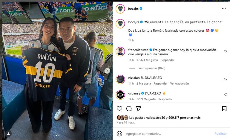 La cantante británica Dua Lipa, quien justamente hizo dos shows en el estadio Más Monumental, estuvo presente en el estadio mirando el partido desde el palco, donde saludó al presidente del club Juan Román Riquelme. Horas más tarde, la cuenta oficial del xeneize le dedicó un posto con algunas imágenes de la artista en la jornada: "Dua Lipa junto a Román, fascinada con estos colores", escribió la cuenta junto a la frase 'me encanta la energía, es perfecta a la gente" que declaró la artista tras el partido.