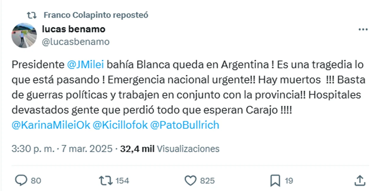 Benamo, referente del automovilismo y uno de los primeros entrenadores de Colapinto, publicó en su cuenta de X: "¡Presidente Javier Milei, Bahía Blanca queda en Argentina! ¡Es una tragedia lo que está pasando! ¡Emergencia nacional urgente! ¡Hay muertos! ¡Basta de guerras políticas, trabajen en conjunto con la Provincia! Hospitales devastados, gente que perdió todo, ¿qué esperan, carajo?".