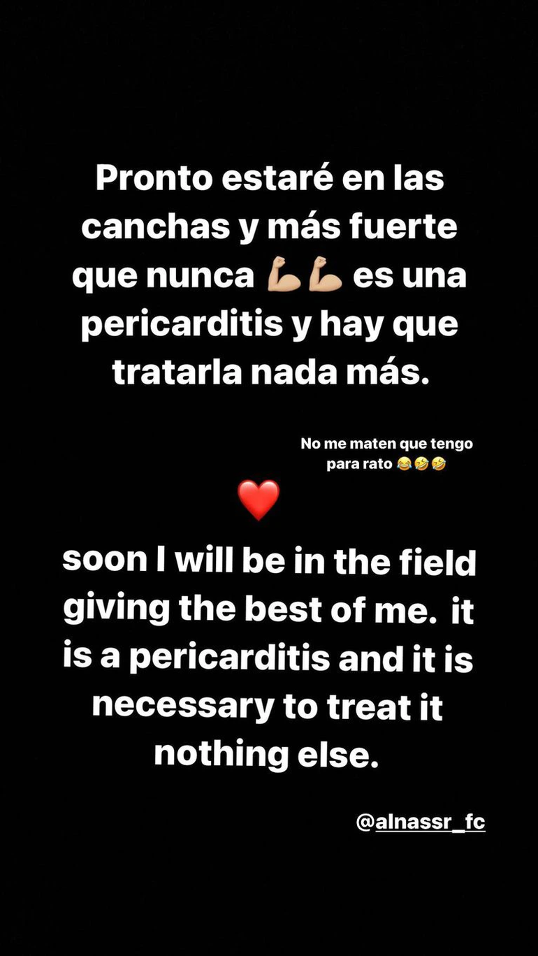 "Pronto estaré en las canchas y más fuerte que nunca. Es una pericarditis y hay que tratarla nada más", publicó el Pity, jugador de Al-Nassr, en su cuenta oficial de Instagram.