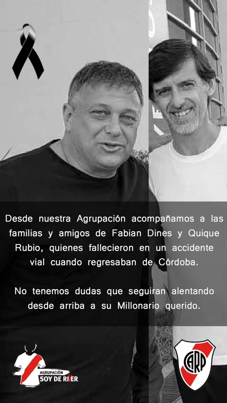 Luego de que trascendiera la noticia, el Club Atlético River Plata emitió un sentido comunicado lamentando lo ocurrido con los dos fanáticos. “Lamentamos profundamente el fallecimiento de Fabián Dines y Enrique Rubio, hinchas de River que sufrieron un accidente de tránsito cuando regresaban de Córdoba tras el partido de anoche”, dice parte del mensaje.