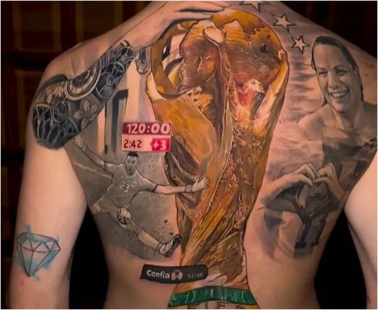 El utilero de la Selección Argentina se dejó tatuar una copa del mundo gigante y a todo color en su espalda, la cual está rodeada por el característico corazón que Ángel Di María hace en los festejos de sus goles, la atajada del Dibu Martínez a Kolo Muani cuando el partido estaba 3-3 en el tiempo suplementario y el brazo de Lionel Messi con su manga tatuada tocando la Copa del Mundo.
