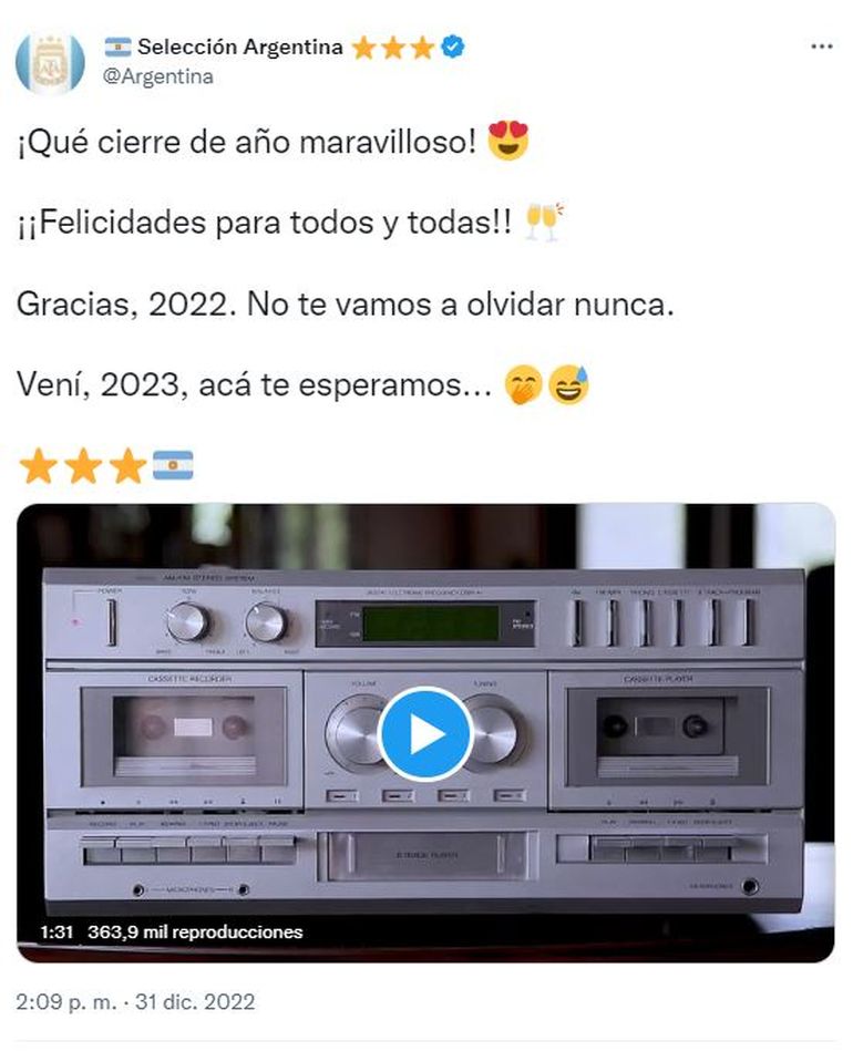 ¡Qué cierre de año maravilloso! ¡¡Felicidades para todos y todas!! Gracias, 2022. No te vamos a olvidar nunca. Vení, 2023, acá te esperamos...", dice el mensaje, acompañado por el video que comienza con la imagen de viejo equipo doble cassetera, de esos que los millennial o generación Y solo han visto en fotos o reflejados en los recuerdos de los adultos.