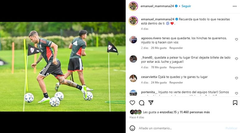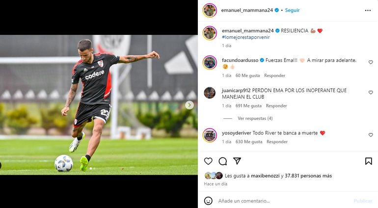 De esto dio muestras el futbolista en sus redes sociales, realizando algunos posteos que, pareciera, lo alejan del Millonario. El primero de ellos refleja la leyenda “resiliencia”, junto a una imagen suya entrenando en el predio que tiene el club en Ezeiza.