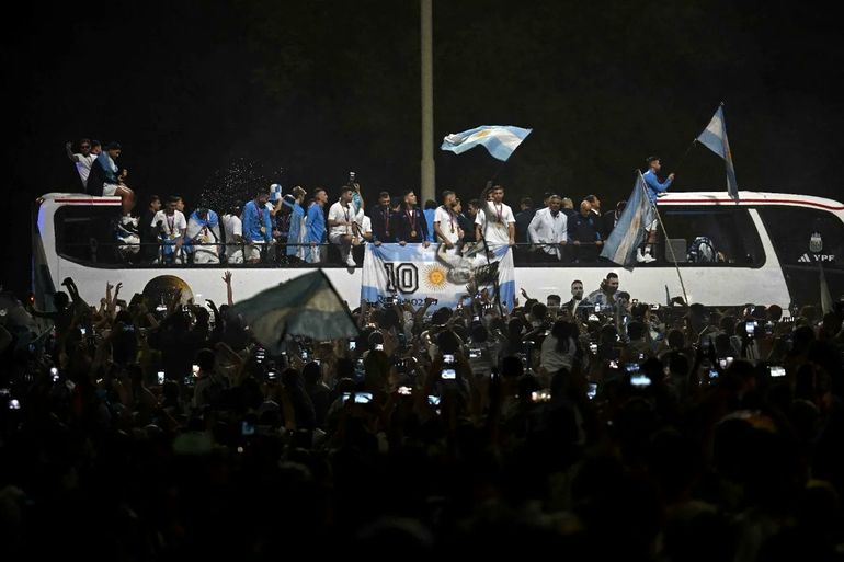 Los transportes que trasladaban a los campeones del mundo partieron al predio de la AFA poco después de las 3 de la mañana, y debieron atravesar una marea humana integrada por decenas de miles de personas que se apostaba a los costados de la autopista aguardando el paso de los campeones.