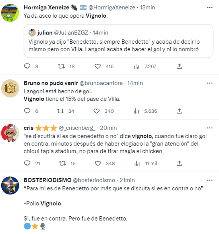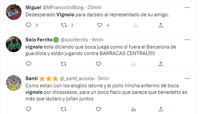 Sebastián Vignolo destacó durante varios pasajes del primer tiempo del partido Barrancas Central- Boca (al cabo del primer tiempo iba 0-3) a los jugadores 'Pipa' Benedetto y Sebastián Villa, aunque ninguno de ellos había convertido goles hasta ese momento. Incluso insistió por varios minutos que el primer gol, que fue en contra de Dattola, había sido convertido por el 9 xeneize.