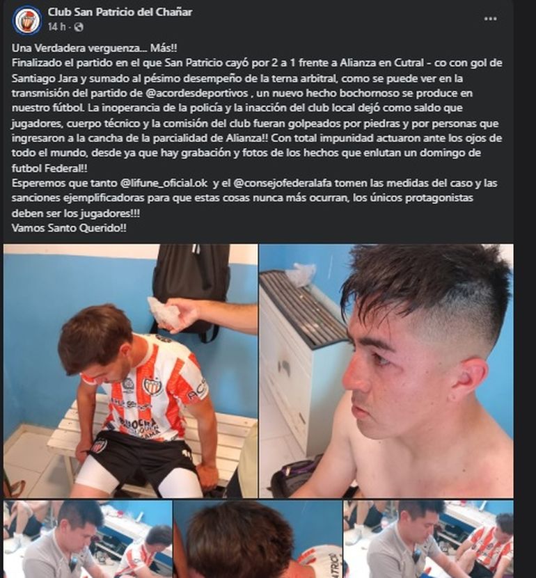 "Una verdadera vergüenza más. Finalizado el partido en el que San Patricio cayó por 2 a 1 frente a Alianza en Cutral Co, y sumado al pésimo desempeño de la terna arbitral, como se puede ver en la transmisión del partido de Acordes Deportivos , un nuevo hecho bochornoso se produce en nuestro fútbol. La inoperancia de la policía y la inacción del club local dejó como saldo que jugadores, cuerpo técnico y la comisión del club fueran golpeados por piedras y por personas que ingresaron a la cancha de la parcialidad de Alianza. Con total impunidad actuaron ante los ojos de todo el mundo. Hay grabación y fotos de los hechos que enlutan un domingo de futbol Federal. Esperemos que tanto Lifune como el Consejo Federal tomen las medidas del caso y las sanciones ejemplificadoras para que estas cosas nunca más ocurran, los únicos protagonistas deben ser los jugadores".