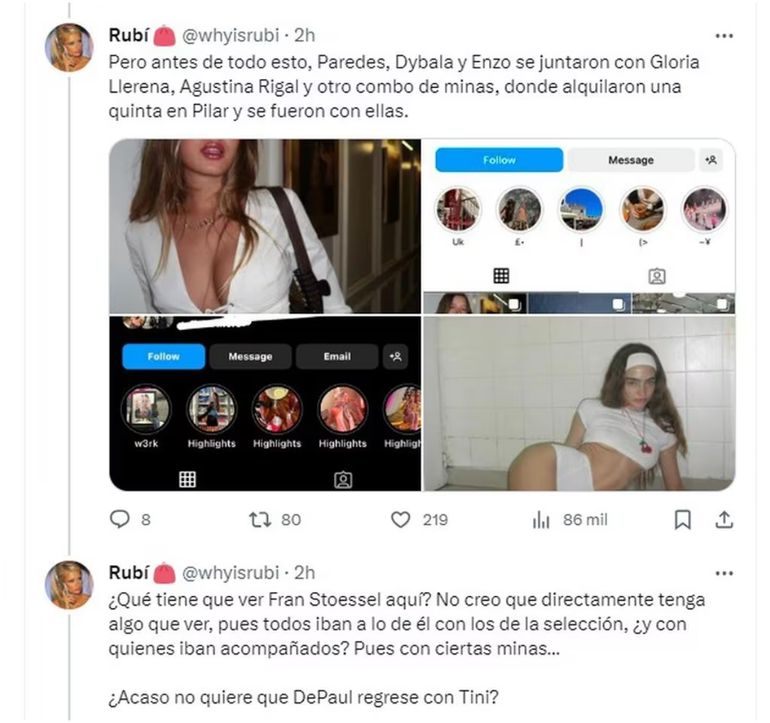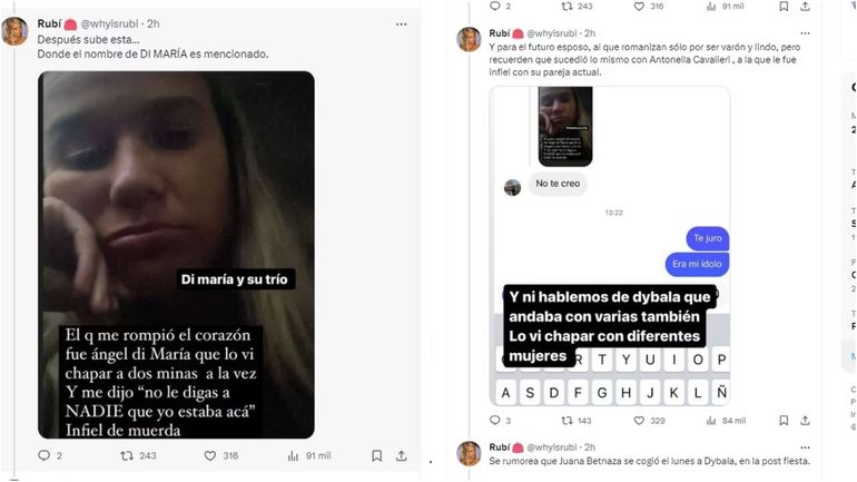 Las redes sociales fueron testigos de un hilo con chats y capturas presentado por la usuaria Rubí (@whyisrubi). Entre los jugadores señalados se encuentran Ángel Di María, Paulo Dybala y Leandro Paredes. Los testimonios de las modelos presentes sugieren situaciones comprometedoras, incluyendo acusaciones de infidelidad y revelaciones sobre la intimidad de los jugadores.