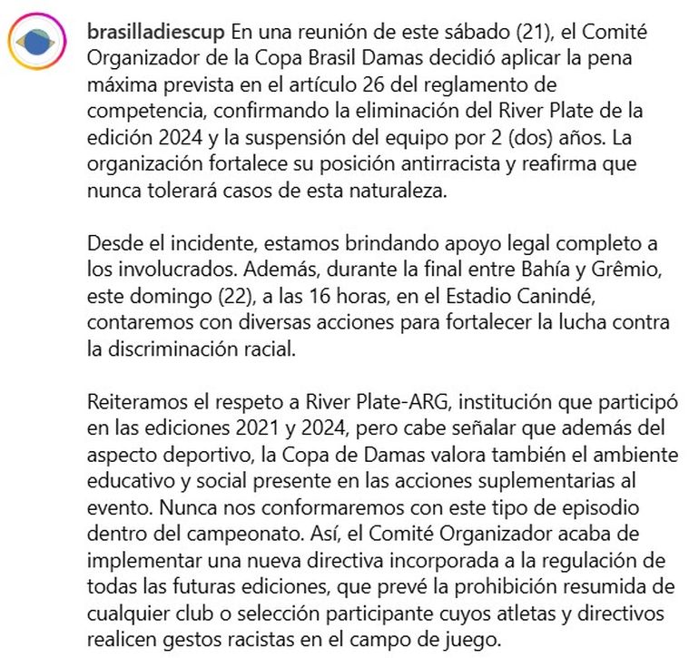 "River Plate manifiesta su más absoluto repudio ante los gestos discriminatorios ocurridos en el encuentro con Gremio por la Brasil Ladies Cup 2024. Comunica que ya está tomando las medidas disciplinarias correspondientes y seguirá trabajando para erradicar este tipo de conductas".