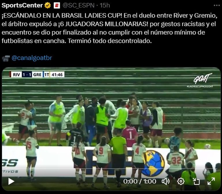 El equipo femenino de River participó de la Ladies Cup, disputada en Brasil y cerró el certamen envuelto en polémicas. El equipo argentino disputaba su tercer partido del torneo frente a Gremio, el cual comenzó ganando pero todo pasó a segundo plano luego que el conjunto brasileño logró empatar el encuentro.