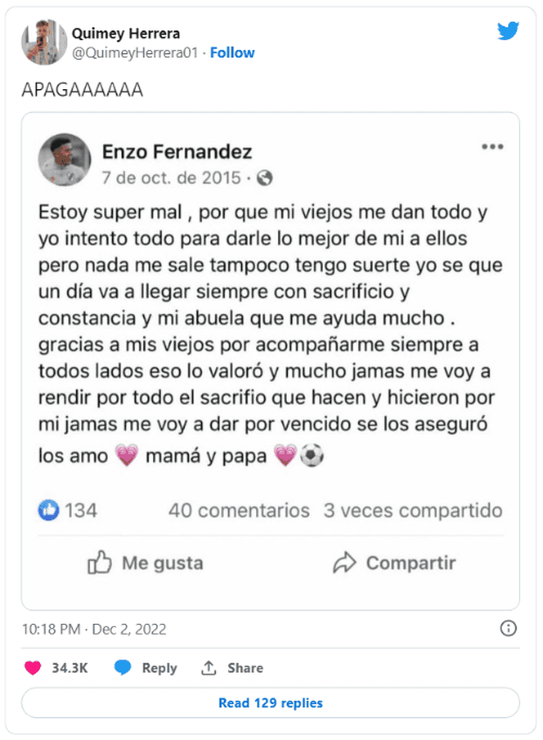 La está rompiendo en Qatar 2022. Es una de las figuras de la Scaloneta, Enzo Fernández. Pero claro que tiene una historia pesada detrás. Ahora, se viralizó un viejo posteo que hizo en 2015 cuando las cosas no iban tan bien, cuando River por ejemplo no le daba lugar y lo cedía a préstamo a Defensa y Justicia.