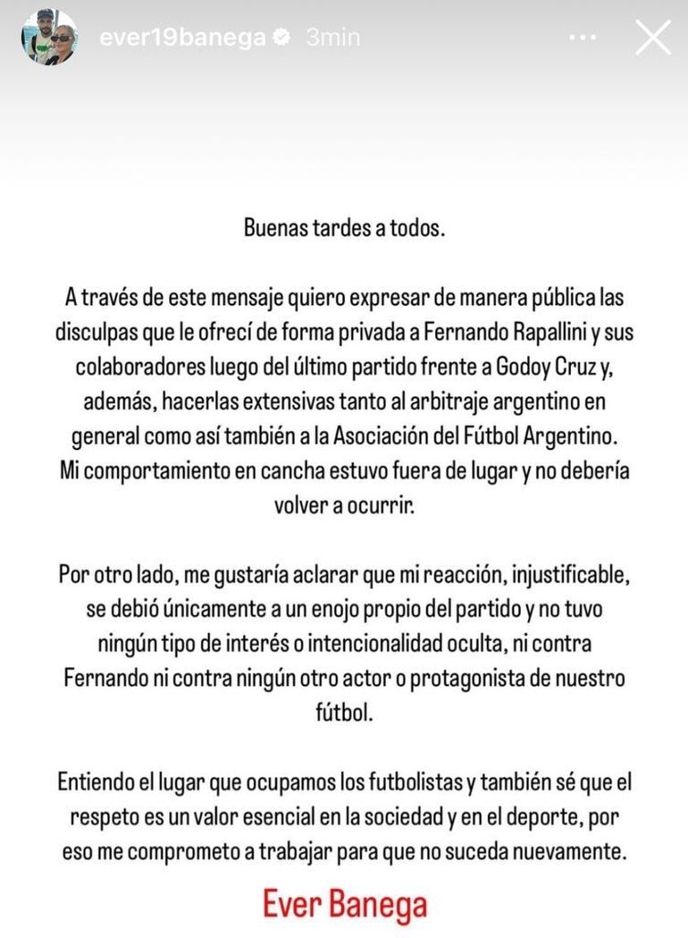 “A través de este mensaje quiero expresar de manera pública las disculpas que le ofrecí de forma privada a Fernando Rapallini y sus colaboradores luego del último partido frente a Godoy Cruz y, además, hacerlas extensivas tanto al arbitraje argentino en general como así también a la Asociación del Fútbol Argentino. Mi comportamiento en cancha estuvo fuera de lugar y no debería volver a ocurrir”, indicó en el texto que difundió en su perfil de Instagram.