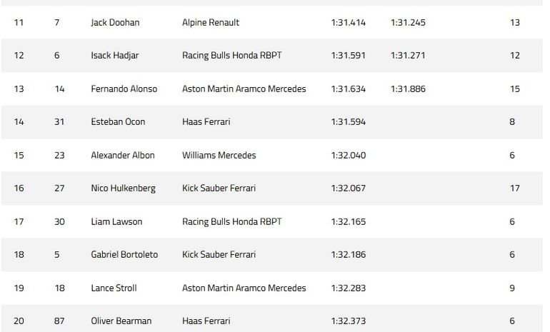 Por detrás, largarán: Jack Doohan (11°), Isack Hadjar (12º), Fernando Alonso (13º), Esteban Ocon (14º), Alexander Albon (15º), Nico Hülkenberg (16º), Liam Lawson (17º), Gabriel Bortoleto (18º), Lance Stroll (19º) y Oliver Bearman (20º).