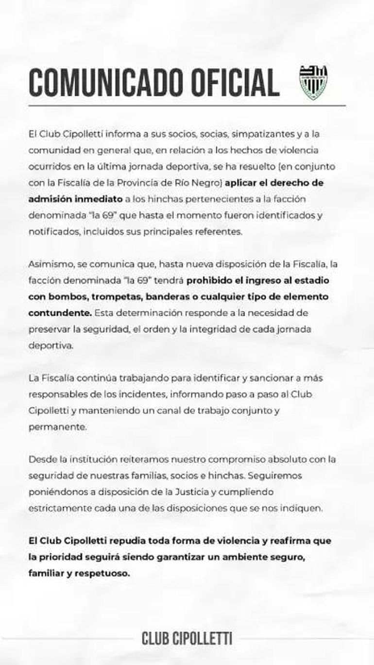 En cuanto a la institución albinegra, durante las últimas horas de la noche del jueves, lanzó un comunicado oficial a través de sus redes sociales. “El Club Cipolletti informa a la comunidad que se ha resuelto en conjunto con la fiscalía de Río Negro, aplicar el derecho de admisión inmediato a los hinchas pertenecientes a la facción denominada 'La 69'”, detalló en su primer párrafo.