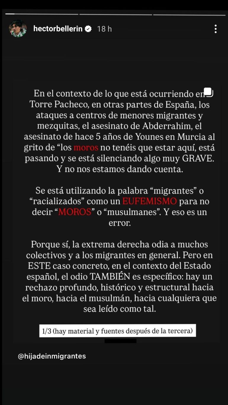 En julio pasado, a través de sus redes sociales, también protestó contra los ataques xenófobos ocurridos en Torre Pacheco, Murcia, donde grupos neonazis se juntaron para atacar a familias y jóvenes inmigrantes.