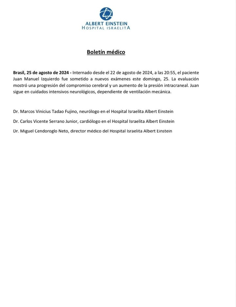 "Internado desde el 22 de agosto de 2024, a las 20:55, el paciente Juan Manuel Izquierdo fue sometido a nuevos exámenes este domingo, 25. La evaluación mostró una progresión cerebral y un aumento de la presión intracraneal. Juan sigue en cuidados intensivos neurológicos, dependiente de ventilación mecánica", aseguraron.