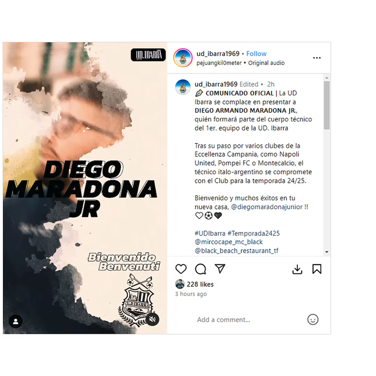 “La UD Ibarra se complace en presentar a Diego Armando Maradona Jr., quien formará parte del cuerpo técnico del primer equipo”, publicó el club a través de sus canales oficiales. Esta decisión marca un cambio estratégico en busca de mejorar el rendimiento del plantel, que actualmente solo tiene un punto de ventaja sobre las posiciones de descenso a Regional Preferente. El técnico compartió el anuncio en una story dentro de su cuenta personal y añadió: “Con todo”.