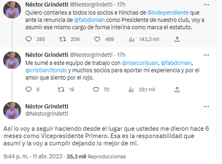 Tras conocerse la decisión de Doman de dejar la presidencia de Independiente, Grindetti anunció que, como vicepresidente primero de la entidad roja, reemplazaría en el cargo al periodista como marca el estatuto del club.
