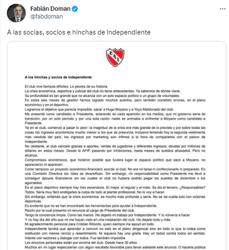 Con una carta dirigida a los socios y socias que difundió en su cuenta de Twitter, Doman manifestó que "la crisis económica, deportiva y judicial del club no tiene antecedentes" y que no encontró "las herramientas para ayudar al club".