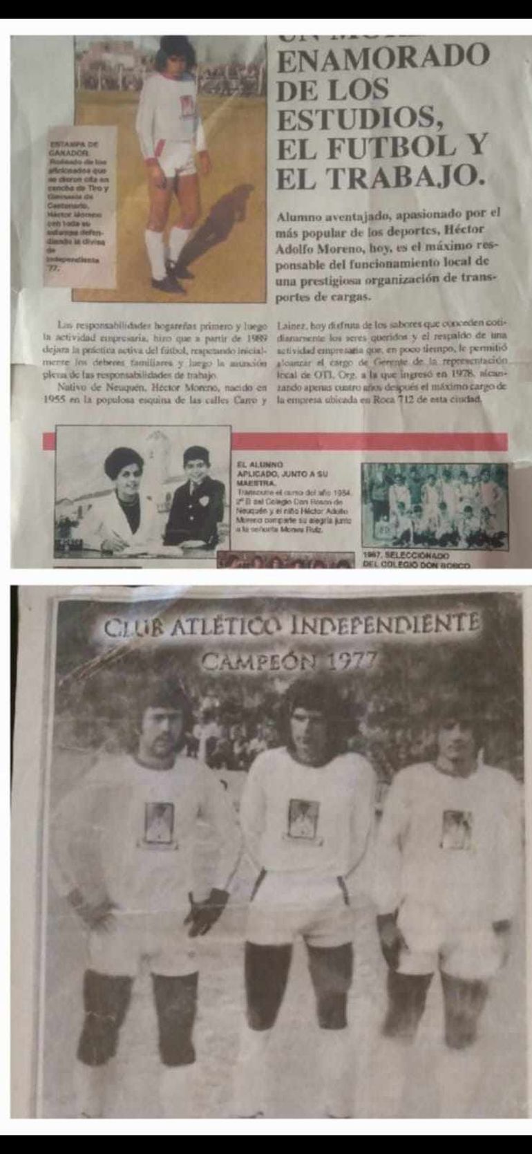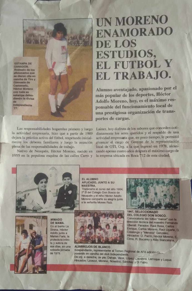De chico la rompía en los potreros de Villa Florencia, en la canchita del Colegio Don Bosco, con su hermano Víctor, o con el "Pela" Rubén Bucarey. Brilló en los 70' en Unión Vecinal, en tiempos en los que el club de Colonia Valentina se metió entre los grandes de la Liga Neuquina. Héctor Adolfo Moreno, "el Pato", era centrodelantero, medía metro ochenta y seis; de piernas larguísimas, ganaba en el área y era dueño de un precioso remate definidor. Goleador.