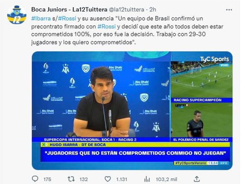 El entrenador de Boca Juniors, Hugo Ibarra, dijo que no le gustó el arbitraje de Fernando Rapallini en la derrota de su equipo ante Racing Club por la Supercopa Internacional, y dio por terminado el ciclo del arquero Agustín Rossi, a quien se le finaliza su contrato a mitad de año y ya tiene firmado un pre contrato con Flamengo, de Brasil.