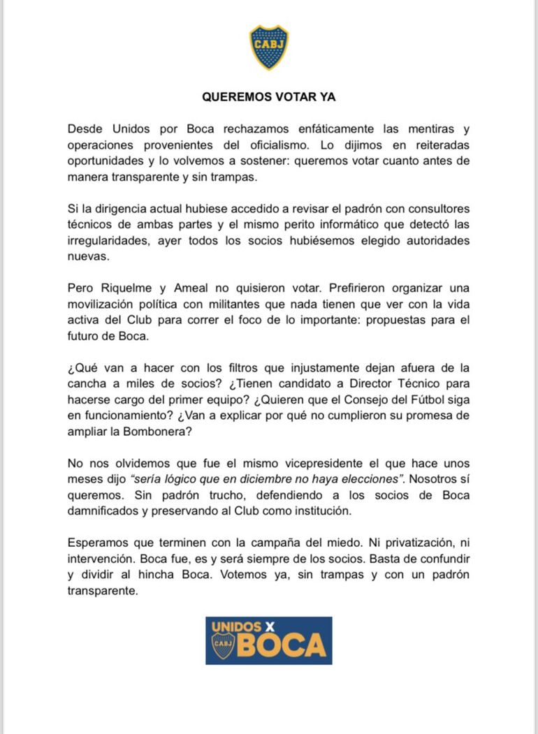 Bajo el título "Queremos votar ya", la agrupación opositora "Unidos x Boca" lanzó un comunicado tras la movilización de los hinchas a favor del oficialismo que tuvo lugar el domingo en La Bombonera. En el mismo, la agrupación comeinza rechazando enfáticamente "las mentiras y operaciones provenientes del oficialismo. Lo dijimos en reiteradas oportunidades y lo volvemos a sostener: queremos votar cuanto antes de manera transparente y sin trampas".