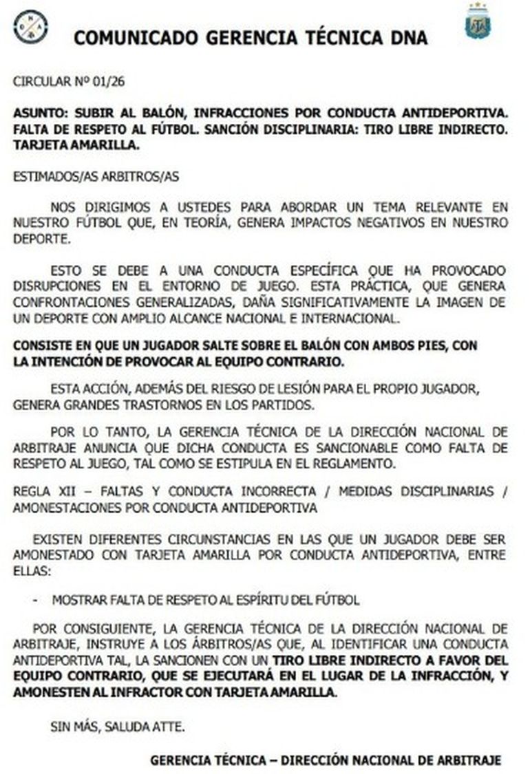 Luego, suma: "Esta acción, además del riesgo de lesión para el propio jugador, genera grandes trastornos en los partidos". Acto seguido detalla la medida: "Por lo tanto, la Gerencia Técnica de la Dirección Nacional de Arbitraje anuncia que dicha conducta es sancionable como falta de respeto al juego, tal como se estipula en el reglamento. Regla VII: Faltas y conducta incorrecta. Medidas disciplinarias. Amonestaciones por conductas antideportivas. Existen diferentes circunstancias en las que un jugador debe ser amonestado con tarjeta amarilla por conducta antideportiva, entre ellas: mostrar falta de respeto al espíritu del fútbol".