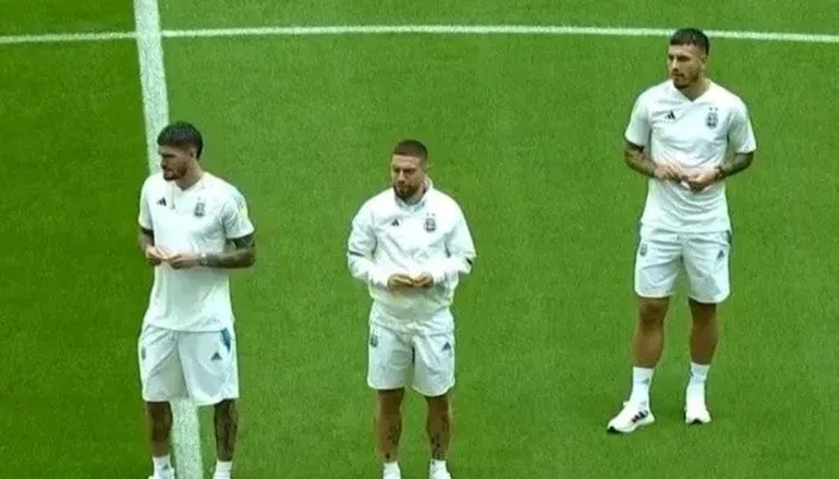 Como suelen hacer cada vez que se ponen la camiseta de la Argentina, los tres mediocampistas salieron juntos desde el vestuario hacia el círculo central del Estadio Lusail comiendo fruta mientras conocían el campo de juego y saludaban a todos los argentinos que ya estaban esperando el partido.