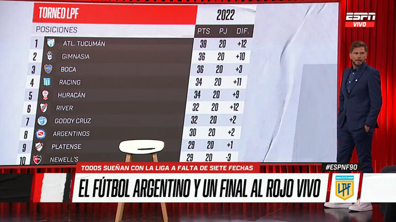 "Yo creo que esta fecha tenían la posibilidad de dejar afuera a River de la conversación", señaló el conductor de ESPN ; y añadió: "River, más allá del rendimiento, de que no tiene el brillo, no tiene la consistencia, como no la tiene nadie en el torneo, es un rival al que querés siempre fuera de la lucha".