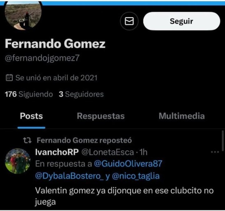 “Valentín Gómez ya dijo que en ese clubcito no va a jugar”, rezaba el polémico mensaje que rettwiteó el padre del jugador. De hecho, esta interacción de Fernando Gómez en las redes fue eliminada pero siguió circulando a partir de la divulgación de una captura de pantalla