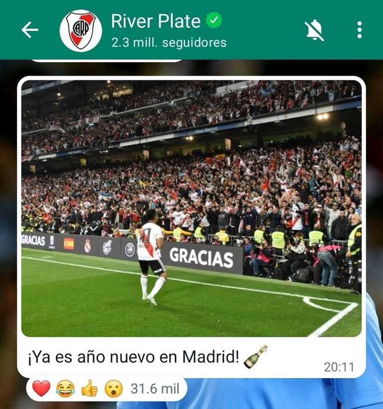 River incorporó este medio el 18 de septiembre y, si bien muchos posteos son los mismos que los de las otras redes (Instagram, Twitter y Facebook), otros son pensados exclusivamente: hay videos, fotos de entrenamientos o partidos y saludos a los fanáticos, entre otros. Siempre con un tono un tanto informal, acorde a cómo está planteada la idea de los canales de novedades de WhatsApp.