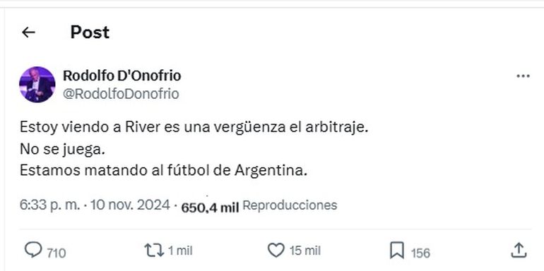 En ese contexto, D'Onofrio se expresó durante el cotejo a través de X (twitter): "Estoy viendo a River es una vergüenza el arbitraje. No se juega. Estamos matando al fútbol de Argentina".