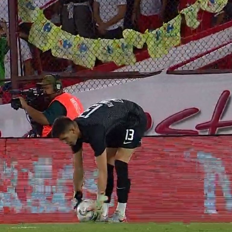La transmisión logró captar el sutil mensaje ubicado en el alambrado. Cuando el arquero Facundo Altamirano se disponía a reanudar el juego, las cámaras enfocaron unas bolsas de Carrefour colgadas, haciendo referencia al viejo estadio del Ciclón en Boedo.