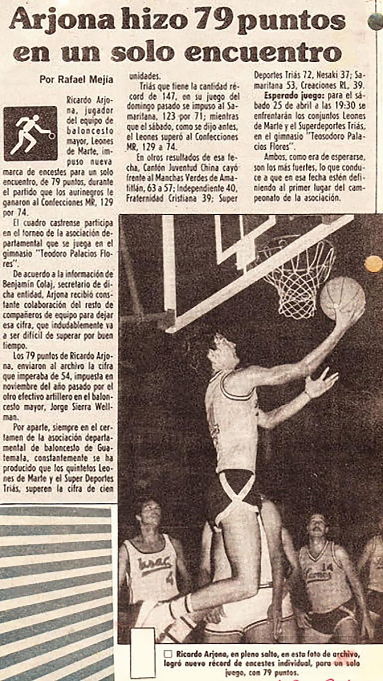 Antes de ser un artista de talla internacional, el cantautor guatemalteco, Ricardo Arjona, fue basquetbolista profesional, inclusive, en paralelo a sus primeros años de carrera musical. Con paso por la selección de Guatemala, Arjona convirtió 79 puntos en un partido con su equipo, Leones de Marte, una marca que recién pudo ser batida en 2005.