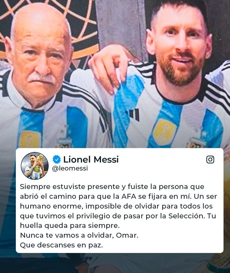“Siempre estuviste presente y fuiste la persona que abrió el camino para que la AFA se fijara en mí. Un ser humano enorme, imposible de olvidar para todos los que tuvimos el privilegio de pasar por la Selección. Tu huella queda para siempre. Nunca te vamos a olvidar, Omar. Que descanses en paz”, escribió Messi.