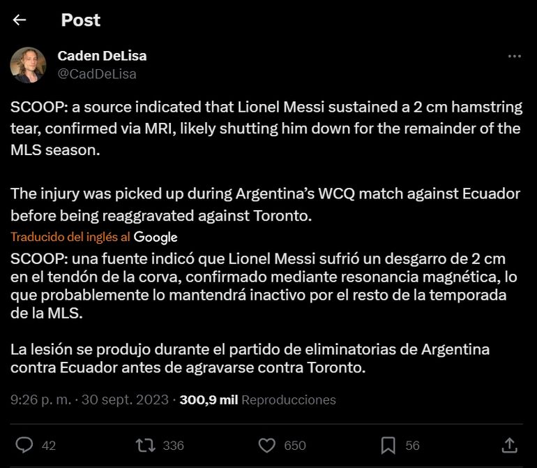 “Lionel Messi sufrió un desgarro de 2 cm en el tendón de la corva, confirmado mediante resonancia magnética, lo que probablemente lo mantendrá inactivo por el resto de la temporada de la MLS”, aseguró el periodista sobre el futuro del 10.